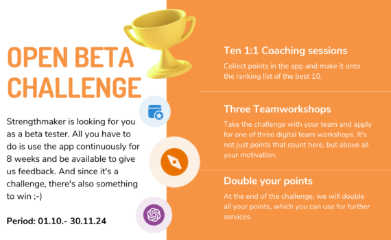 Wir bei Strengthmaker glauben, dass jeder Mensch einzigartige Stärken hat, die den Unterschied machen können – im Beruf, im Privatleben, überall. Unsere Vision ist es, dir dabei zu helfen, genau diese Stärken zu entdecken, zu entfalten und mit Freude zu nutzen. Die Open Beta Challenge unserer Strengthmaker App ist eine