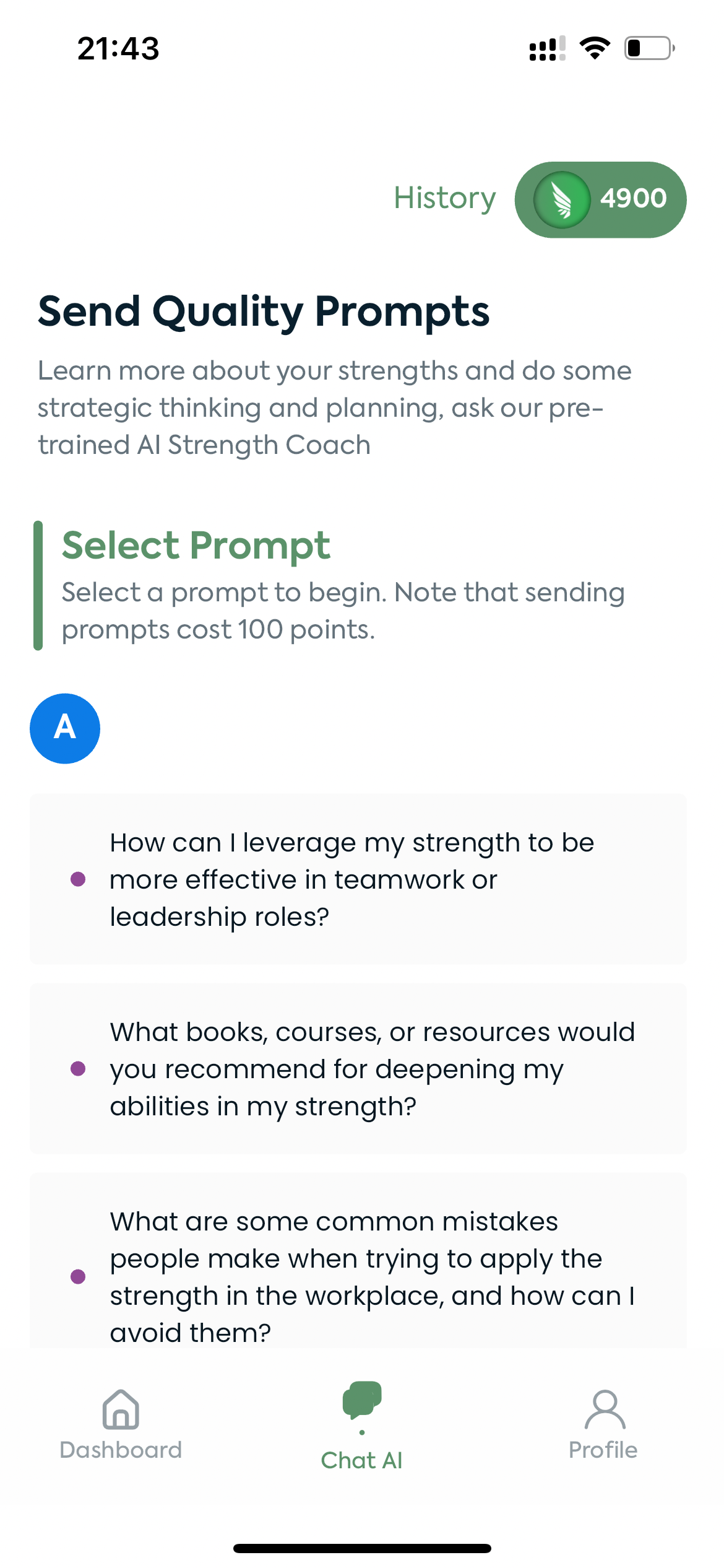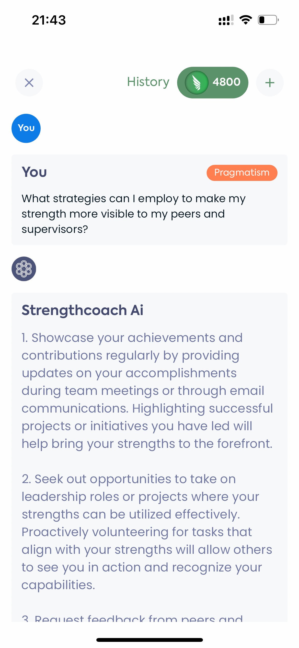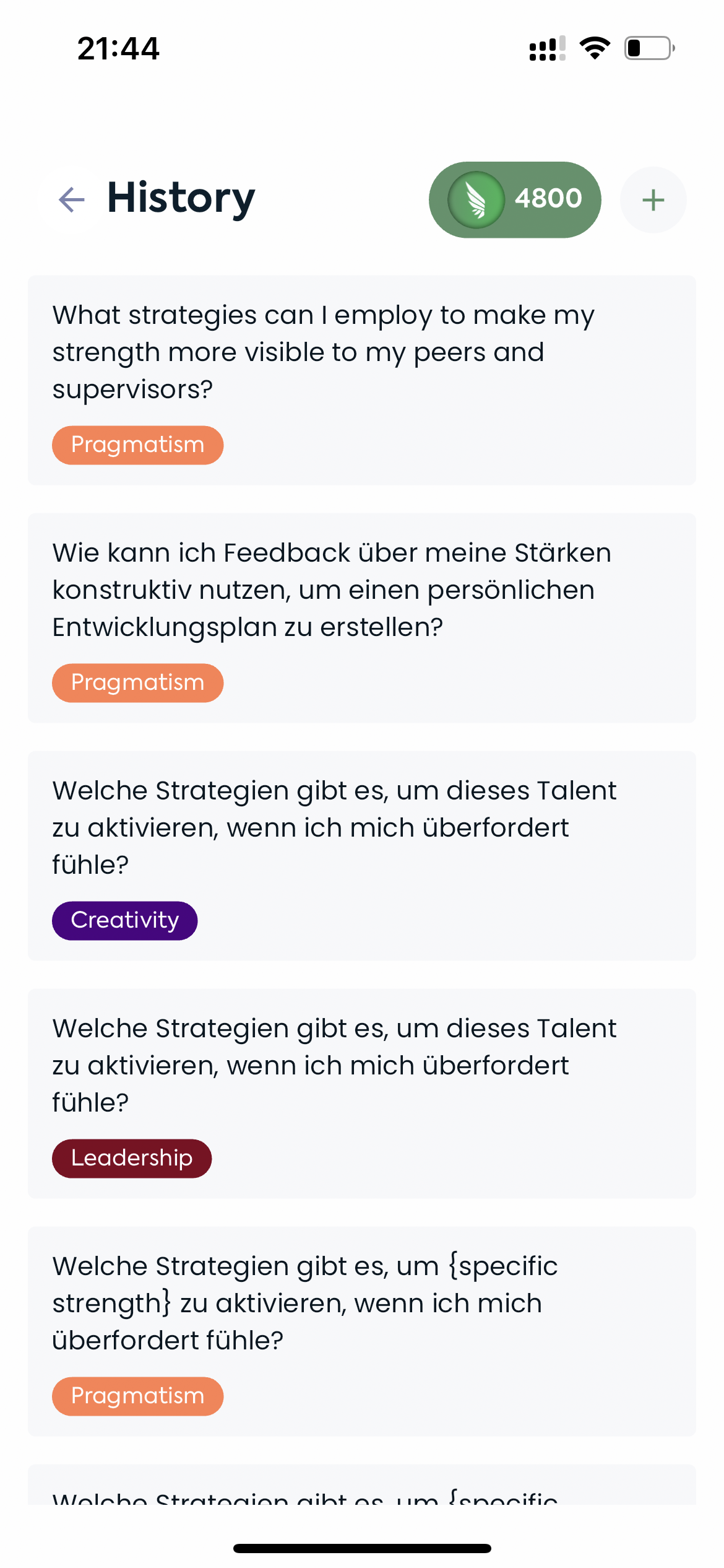 Im AI Chat kannst du aus einer Vielzahl von vorgefertigten Prompts auswählen. Das Besondere daran? Jeder dieser Prompts lässt sich gezielt mit einer deiner Top 5 Stärken kombinieren. So erhältst du Antworten, die genau auf dich und dein Potenzial abgestimmt sind. Ob es um die Förderung deiner Stärken im Arbeitsalltag, um Entscheidungsfindung oder um den Umgang mit Stresssituationen geht – der AI Coach hilft dir, deine Ressourcen optimal zu nutzen.